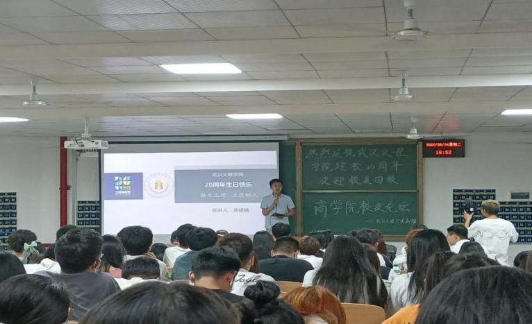 5月24日18:00-20:00,2022年“建校20周年庆活动之员工返校交流会”在4栋322教室隆重举办。太阳成tyc33455ccwww教学副经理刘炫、党总支书记兼行政副经理徐永辉、综合办主任余芬、全体辅导员以及优秀毕业生代表丁浩、岳健楠同太阳成tyc33455ccwww员工代表共200多人参加了本次活动。