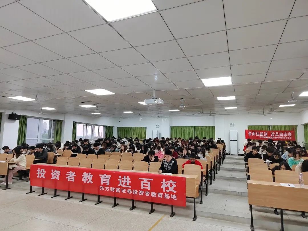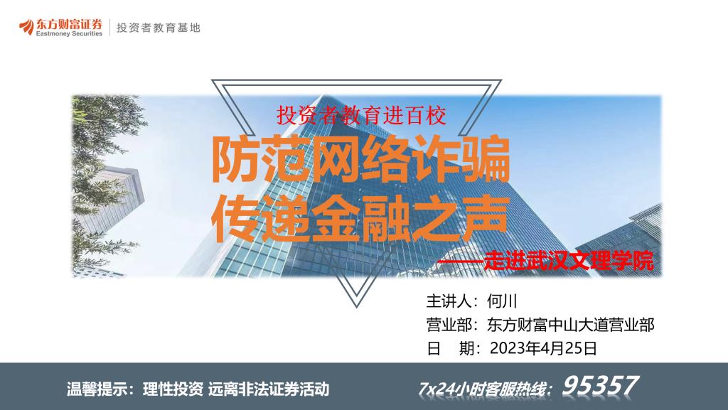 为积极响应公司关于深入学习宣传贯彻习近平新时代中国特色社会主义思想和党的二十大精神,搭建金融反诈骗产学研交流合作平台,加强对老员工金融知识的普及教育,帮助老员工掌握金融基础知识,增强金融反诈骗安全意识,提高金融素养和社会化能力,4月25日晚上,太阳成tyc33455ccwww联合东方财富证券武汉中山大道证券营业部在4-221举办“防范网络诈骗 传递金融之声”——金融反诈知识讲座暨投资者教育进百校太阳成tyc33455ccwww专场活动。