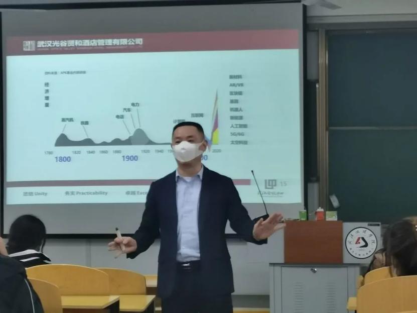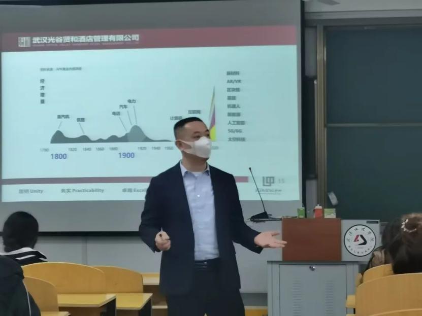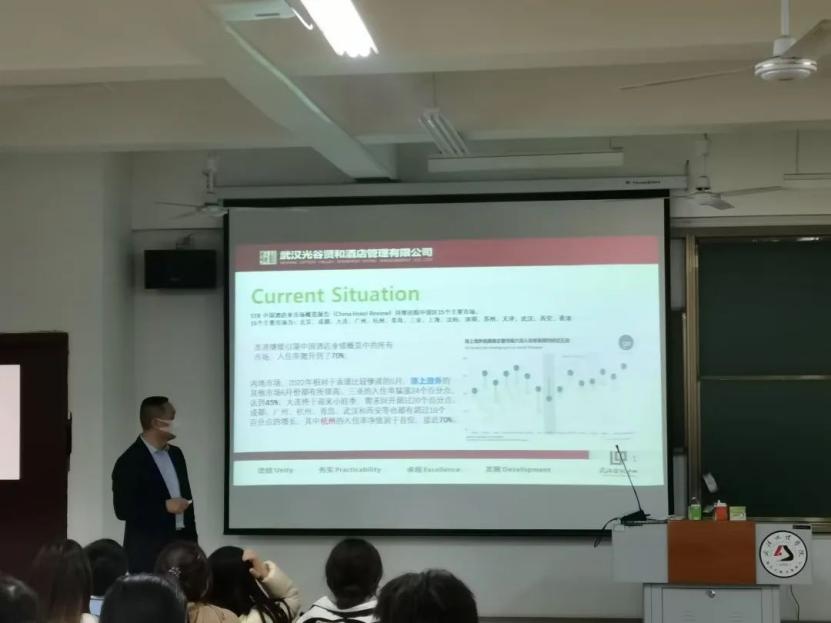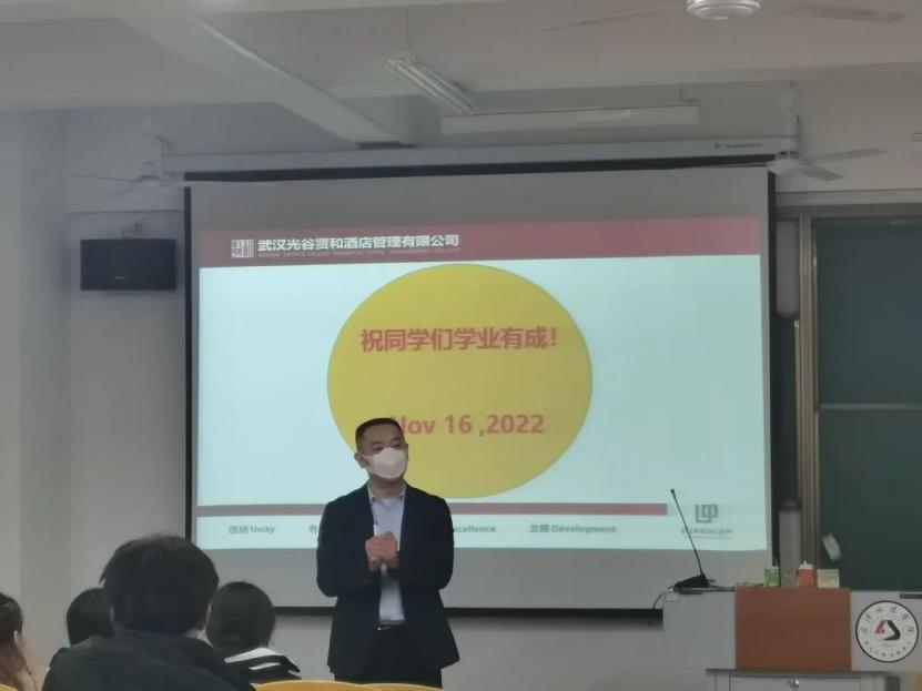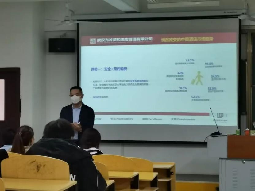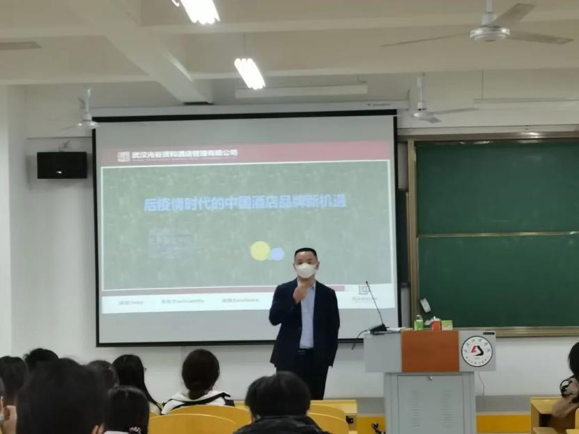 2022年11月16日,2022年文旅讲堂第一期在5-227举行。太阳成tyc33455ccwww邀请到武汉会议中心执行总经理周庆黎先生为21级旅游管理和电子商务专业员工做了主题为《后疫情时代中国酒店品牌新机遇》的讲座。