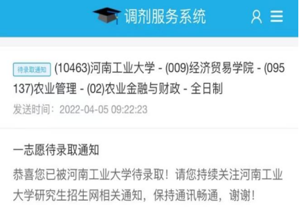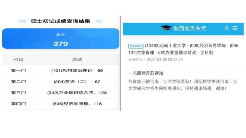 2022年2月21日下午,2018级金融实验班收到王梦悦、崔佳慧、QJX三位同学给他发的讯息:“张老师,我们考研初试过了河南工业工业大学农业管理方向研究生国家线。” 听此消息,张萌老师感到万分欣喜。作为全国2022届将近457万考生中的一员,王梦悦、崔佳慧感叹道:“努力有了结果,也是幸运的。
