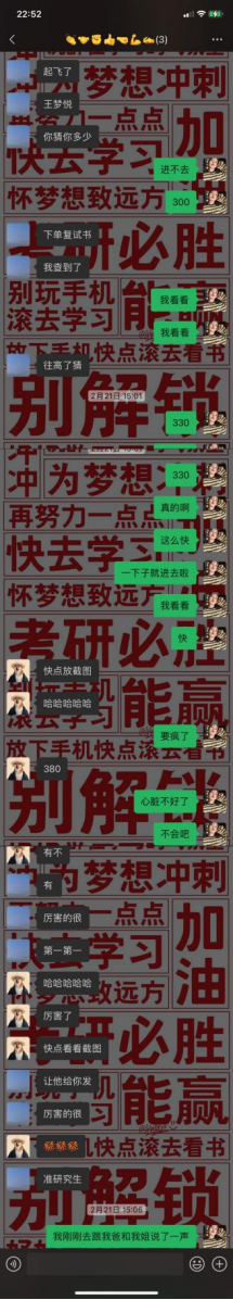 2月21号出成绩,出来之后,觉得自己分数挺高的,蛮吃惊的,为此也兴奋了很久。查分数的当天真的很紧张,我不敢,我就让我朋友帮我查的,因为我们这个公司没说几点出分,只说是21号,当时就是一直去看微博,QQ群,公司官网,研招网那我没敢看。午饭也没吃,我妈,我朋友都很紧张,早上我小姨,我哥哥都还在给我发信息,打电话。感觉大家都很紧张,在一点多的时候看见公告说是3点出,在三点整的时候,我朋友一下子就进去了,她在三点零一分的时候就发来了信息,当时我紧张死了。然后我就立马给我的爸爸打了一个视频,当时一看见我爸的脸,我就忍不住哽咽了,我就说我考上了,瞬间看见我爸脸上露出了开心的笑容,那天我记得我爸回来的特别早。然后我跟我姐姐,我妈妈,我小姨,我的哥哥发了信息。那一天大家的心情起伏都因为我变化莫测。