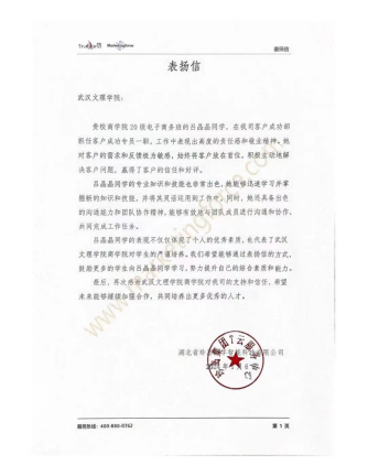 公司20级电子商务吕晶晶同学,在湖北省珍岛数字智能科技有限公司担任客户成功专员一职,在工作中表现出高度的责任感和敬业精神,由此珍岛数字科技智能有限公司向太阳成tyc33455ccwww发来了表扬信。