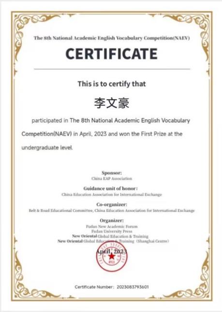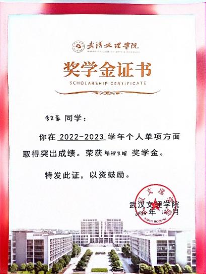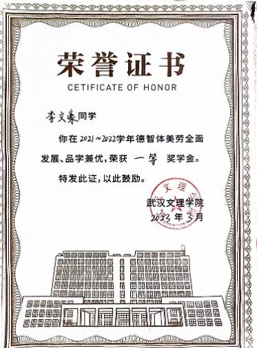 李文豪深知学习的重要性,两年综测第一,连续三年德育、智育素质排名双第一,多次荣获“一等奖学金”、“创新创业奖学金”、“精神文明奖学金”“突出才艺奖学金”。他的专业课成绩平均分90.07,英语类成绩平均分90,思政类成绩平均分90.69,三年来成绩稳步上升。