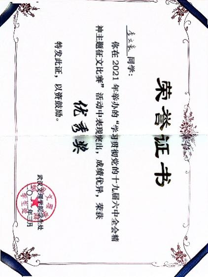 青春奉献,敢为人先,他连续三年在家乡和平村党员活动中心,担任志愿者,参与一线挖沟抗旱工作。在武汉市硚口手志梦青年志愿者协会,助力为聋人朋友打开心结,发布30余篇文章,呼吁公众对残疾人的理解和关爱。今年9月获该单位的表扬信。登湖北日报、孝感日报等主流媒体,曾被孝感市教育局和团委评为“最美孝德青少年”榜首,今年9月底,被孝感日报记者邀请专访,宣传“融文汇理,立德树人”的精神。