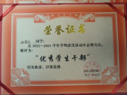 军政淬炼中,他同样表现突出。2023年6月军训期间,所在的三营八连一排先后获评“军训内务卫生先进集体”和“军训歌咏比赛优等奖”,个人获评“军训优秀学员”;两次参与团学干部培训(2023年第十九期、2024年第二十一期)均以优异成绩结业,带领班级获评校级“先进班集体”,个人多次荣获“优秀员工干部”称号,用行动诠释了青年担当。