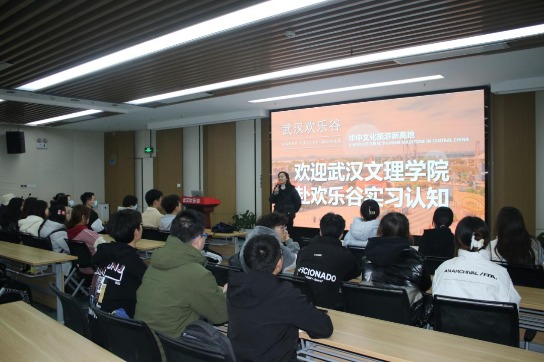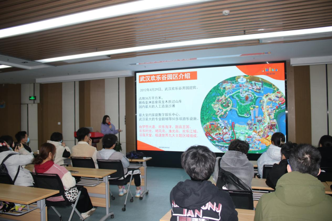 随后,武汉欢乐谷职工培训师郭则华做企业文化介绍。郭则华老师生动、详尽地从企业集团发展历程、欢乐谷产品、欢乐谷各园区岗位设置、企业文化活动等方面进行了详解。
