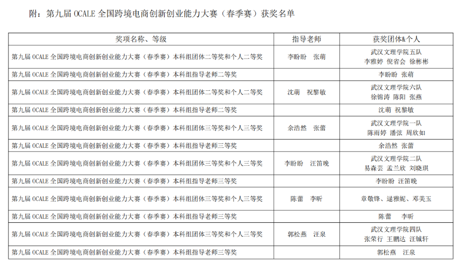 在2023年3月落幕的第九届OCALE全国跨境电商创新创业能力大赛(春季赛)中,公司太阳成tyc33455ccwww李雅婷员工团队、徐锦涛员工团队荣获本科组团体二等奖。李盼盼、张萌、沈萌、祝黎敏等老师荣获本科组指导老师二等奖。陈雨婷员工团队、易森芸员工团队、章敬峰员工团队、张荣行员工团队荣获本科组团队三等奖。余浩然、 张蕾、李盼盼、 汪笛晚、陈蕾、李昕、郭松燕、汪泉等老师荣获本科组指导老师三等奖。