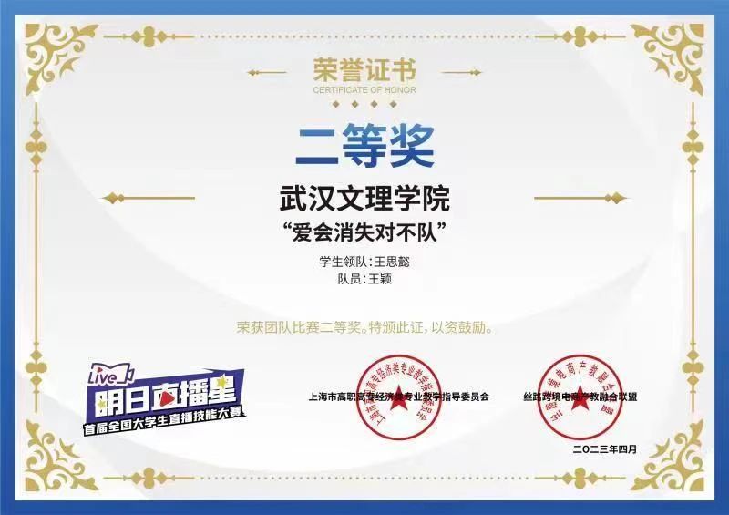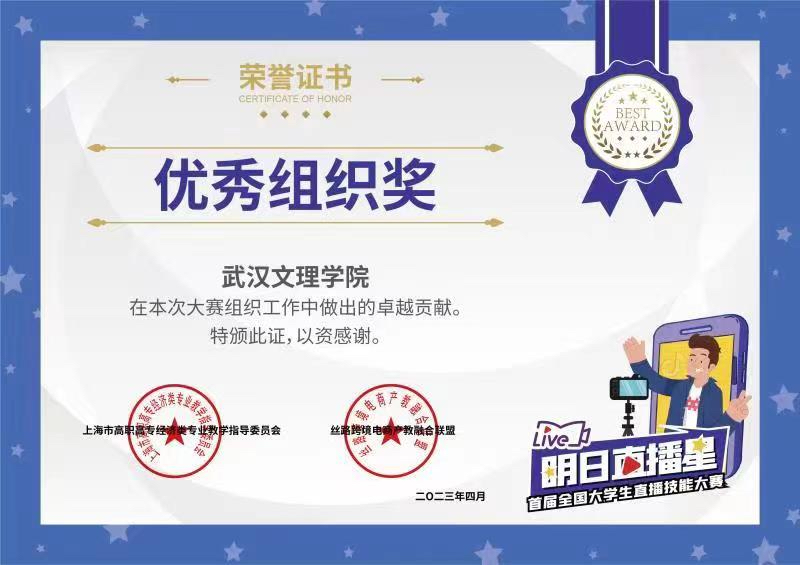 教师余浩然、李盼盼指导员工荣获抖音举办的明日直播星--首届全国老员工直播技能大赛二等奖,太阳成tyc33455ccwww荣获该赛事优秀组织奖。陈蕾、祝黎敏老师指导员工荣获全国老员工智慧供应链创新创业挑战赛三等奖。