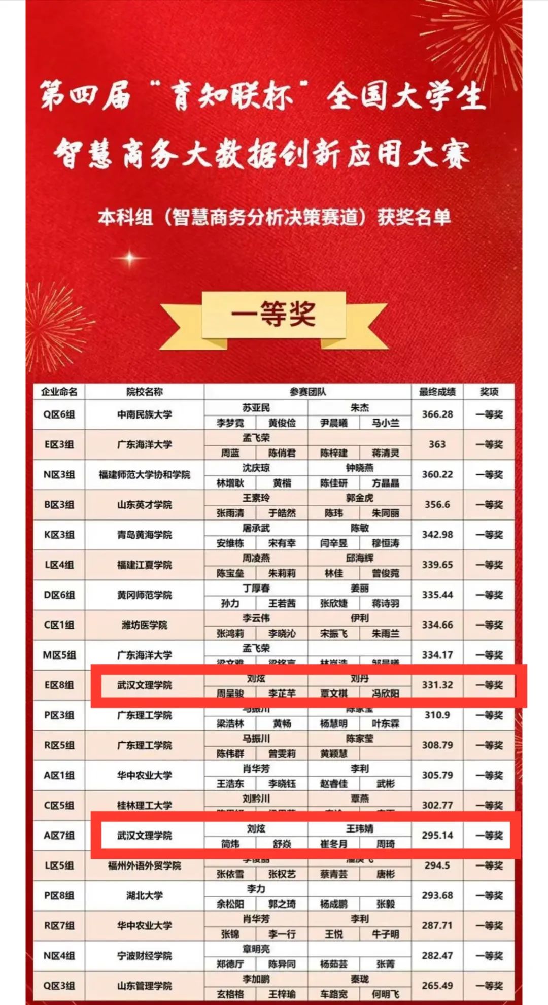 4月,2023年第四届“育知联杯”全国智慧商业大数据创新应用大赛暨亚洲太阳成tyc33455ccwww数智精英挑战赛传来喜讯,太阳成tyc33455ccwww刘炫、刘丹、王玮婧老师指导的周呈骏、李芷芊、覃文琪、冯欣阳、简炜、舒炎、崔冬月、周琦分别组成的两个员工团队均荣获本科组(智慧商务分析决策赛道)一等奖。