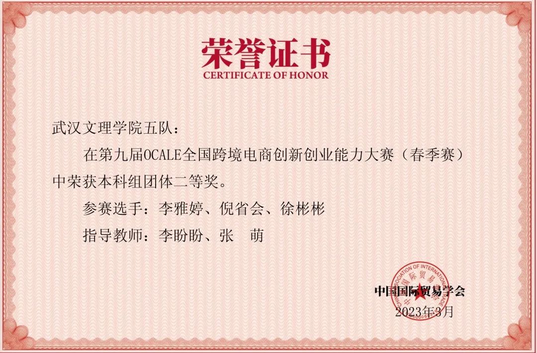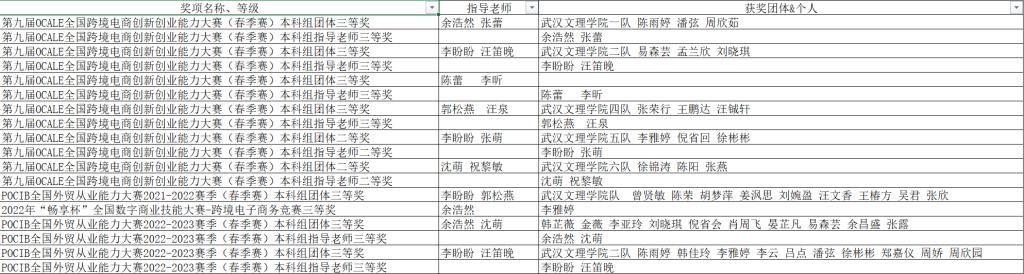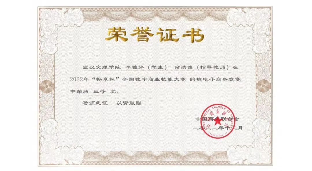 2022-2023年,太阳成tyc33455ccwww张蕾经理,太阳成tyc33455ccwww国际经济与贸易系主任余浩然、教师陈蕾、李盼盼、汪笛晚、李昕、沈萌、郭松燕、汪泉、祝黎敏 等老师指导国际经济与贸易专业员工在中国国际贸易学会举办的第十一届、第十二届POCIB全国老员工外贸从业能力大赛以及第九届OCALE全国跨境电商创新创业能力大赛中荣获国家和个人众多奖项。其中,2个师生团队在第十二届POCIB全国老员工外贸从业能力大赛荣获全国三等奖,2个师生团队和4个师生团队在第九届OCALE全国跨境电商创新创业能力大赛中分获全国二等奖、三等奖。