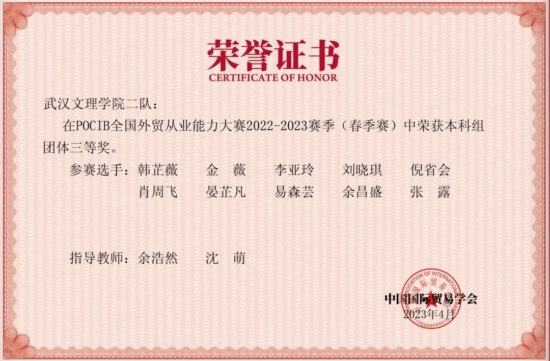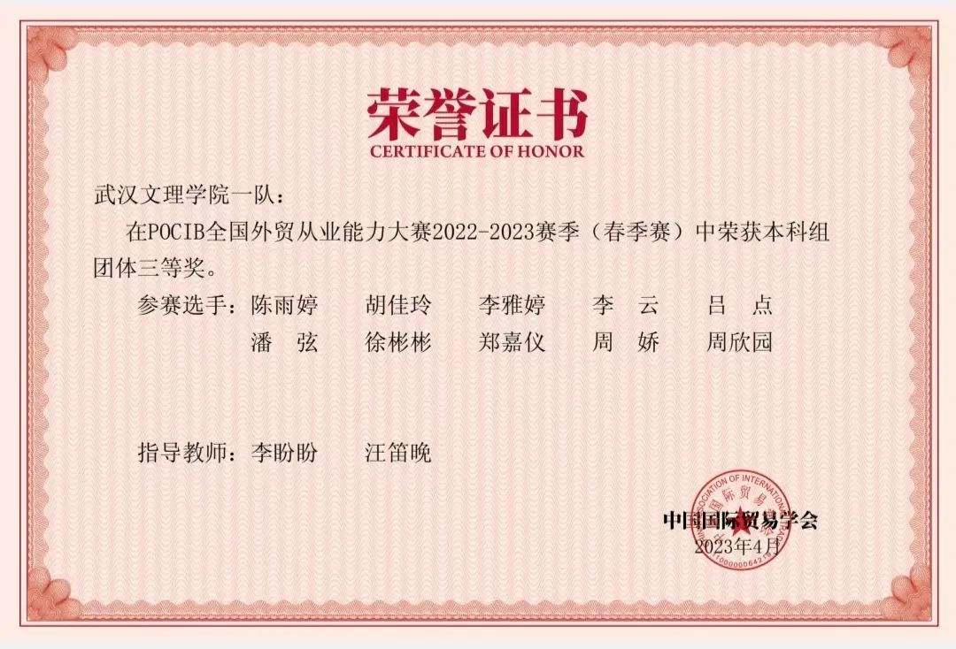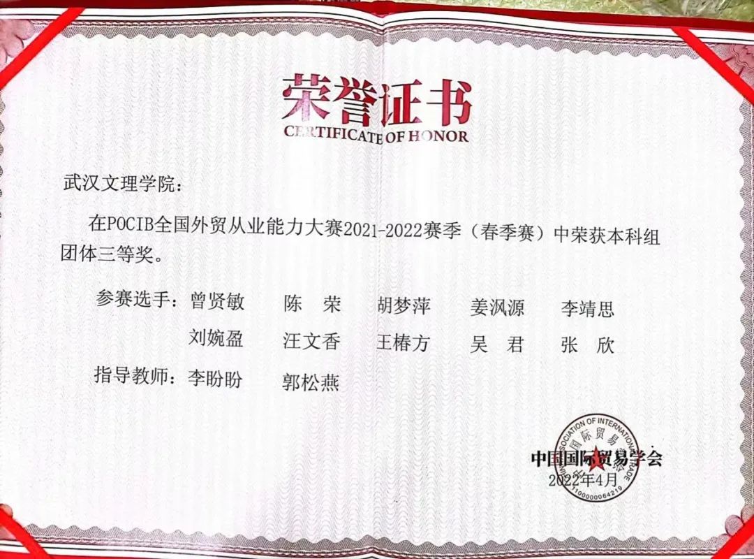 2022年中国国际贸易学会主办的“第十一届POCIB全国外贸从业能力大赛(春季赛),详情请点击:【学科竞技】2019级国贸员工荣获第十一届POCIB全国老员工外贸从业能力大赛团体三等奖